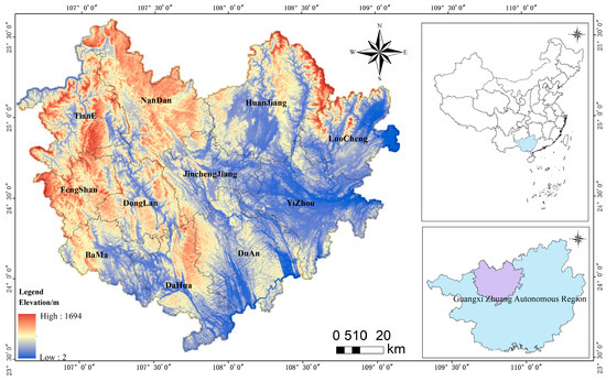 Hechi City is located at the northwestern border of Guangxi, at the southern foot of the Yunnan–Guizhou Plateau, and serves as an important passageway from the southwest to coastal ports. It is situated between 106°34′–109°09′ E longitude and 23°41′–25°37′ N latitude and bordered by Liuzhou to the east, Nanning to the south, Baise City to the west, and Qiannan Buyi and Miao Autonomous Prefecture of Guizhou Province to the north. The city spans 260 km east to west and 228 km north to south, covering a total area of 33,476.47 km2. It administers 2 districts and 9 counties. Hechi City is a typical large rocky mountainous area with extensive mountain distributions. It is also one of China’s major karst landform areas, with karst topography covering 65.74% of its total area. As of the end of 2020, the total area of soil erosion in Hechi City was 6491.78 km2. Rocky desertification land accounts for 21.60% of this area; furthermore, soil erosion accounted for more than 35% of the total rocky desertification area in Guangxi. The geomorphological resources are characterized by many rocks, few flat lands, and susceptibility to drought and flooding. Economically, the service industry is booming, with rapid tourism development leveraging the city’s health and longevity resources. The urban population continues to grow, with the urbanization rate steadily increasing. In 2020, the total registered population of the city was 4.3383 million. The population is mainly concentrated in the eastern and southern regions, particularly in Du’an Yao Autonomous County, Yizhou District, and Dahua Yao Autonomous County, whereas Tian’e County and Fengshan County in the west have relatively few inhabitants.