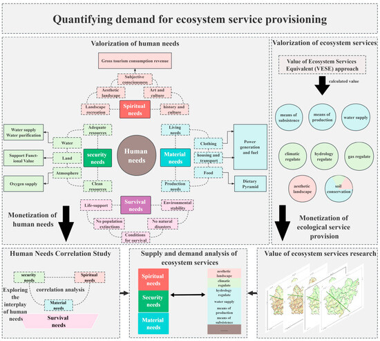 ESs belong to the supply side and do not directly possess economic attributes. The existence of human needs gives ESs economic value. Marx and Engels’ theory of supply and demand proposes that the purpose of production is to meet consumption, and the purpose of supply is to meet demand. Supply and demand are premised on each other, with demand exerting a certain influence on supply. It is impossible for demand to be passively determined by supply without conditions. Therefore, focusing solely on supply and ignoring demand is one-sided. Transparency in the value of supply and demand for ecosystem services can lead to their recognition in public decision making, valuing, and taking full account of the role of natural capital. Values have a double meaning, referring to both what we consider important (i.e., goals or objectives) and the relative value of trade-offs (the contribution of an object or behavior to the achievement of a particular goal) [36]. Consequently, there is a need to conduct research on the valuation of human needs in ESs to further refine the concept of ES value. While research on valuations has been conducted at the supply level of ESs, such as studies on ES value [37,38] and equivalent factors, related research from the perspective of the valuation of human needs is lacking.