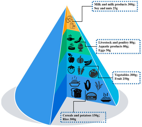 Mature research has been conducted on the daily dietary structure of living materials [48]. In 1992, the U.S. Department of Agriculture officially released a “Food Guide Pyramid” for a healthy dietary structure to maintain the absorption of nutrients for daily life; many countries have developed dietary guidelines to guide their residents toward a balanced diet. In 1997, China released the “Chinese Residents’ Dietary Guidelines” and “Chinese Residents’ Balanced Dietary Pagoda.” With the development of China’s society and economy, the dietary consumption and nutritional status of Chinese residents have changed significantly. To help residents balance their diet to obtain reasonable nutrition and improve their national health, the Chinese Nutrition Society has issued new versions of the “Chinese Residents’ Dietary Guidelines (2007)” and “Chinese Residents’ Balanced Dietary Pagoda (2007).” This paper localizes the dietary pyramid on the basis of the local output of the study area and the consumption habits of residents recorded in the statistical yearbook, as shown in Figure 5, calculates the average daily consumption per person, and then monetizes the consumption of each type of food on the basis of its selling price, thus monetizing the living material needs of humans. The calculation formula is as follows: