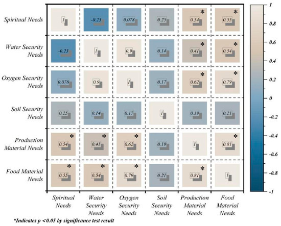 (2) Overall, there is a positive correlation among different human needs. Spiritual needs and material needs generally have a significant positive correlation, with an average correlation coefficient of 0.54. There is no significant correlation between safety needs and other needs, whereas safety needs and material needs are positively correlated, with an average correlation coefficient of 0.6. The definitions of human needs were combined; the results indicate that a certain hierarchical relationship exists between material needs and the other two types of needs, whereas spiritual needs and safety needs have the same hierarchical level.