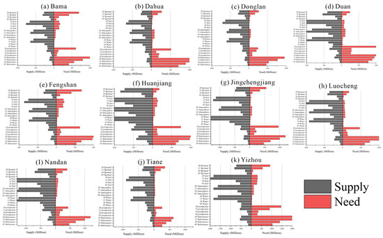 (3) Overall, the supply of living materials in all areas is far below demand; the supply capacity of production materials in most areas cannot meet the growing human demands; the supply of safety needs in all regions far exceeds demand; and in terms of spiritual needs, the supply and demand in the study area are steadily increasing. The exceptions are Bama and Fengshan in 2020, where the supply in other regions could meet human needs.