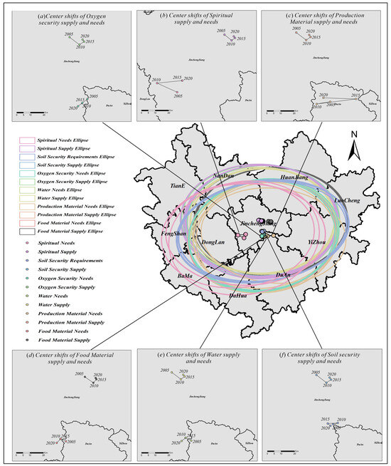 (4) The centers of gravity of various types of supply and demand are basically distributed within Jinchengjiang District, and only the center of gravity of production material demand is in northern Du’an County. There are two types of centers of gravity of human demand, namely, the demand for oxygen safety and the demand for subsistence materials, whose distances from their corresponding centers of gravity of supply have increased. The distances between the remaining centers of gravity of demand and their corresponding centers of gravity of supply have decreased. The difficulty of meeting most supply and demand relationships is decreasing, and needs are being met more easily.