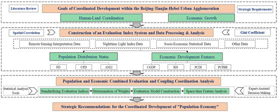 The key target of coordinated development in the BTHUA is to promote rational population distribution, high-quality economic development, and effective coordination between the two. Thus, this study was conducted following the path of “objective determination → modeling → evaluation and analysis → countermeasures and suggestions” (Figure 1). Firstly, the evaluation objective was determined based on the targets and requirements for the coordinated development in the BTHUA, focusing on optimizing the spatial population layout and achieving high-quality economic development. Secondly, a comprehensive “population–economy” evaluation indicator system was constructed following the principles of being scientific, systematic, representative, measurable, and comparable. Relevant data were collected and processed. Population distribution and economic development evaluation models for the counties were constructed through the standardized processing of evaluation indicators and the determination of weights. Furthermore, comprehensive quantitative evaluations and spatial–temporal characteristic analyses of the population and economy were conducted to quantitatively assess the level of coupling coordination among the “population–economy” of the counties within the BTHUA. At the end of this paper, countermeasures and suggestions are proposed for the coordinated development of the “population–economy” within the BTHUA.