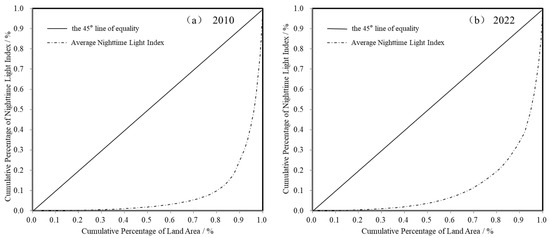 Figure 2. Lorenz curves of average nighttime light index in 2010 and 2022 (a,b).