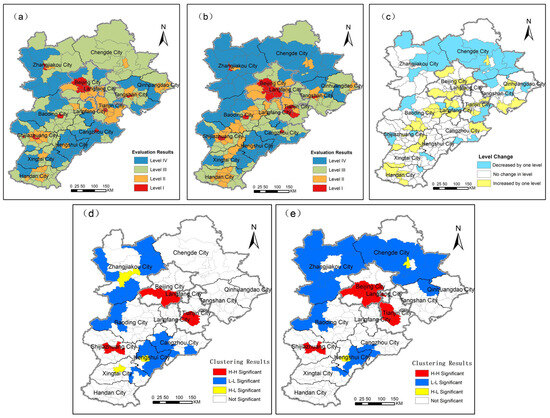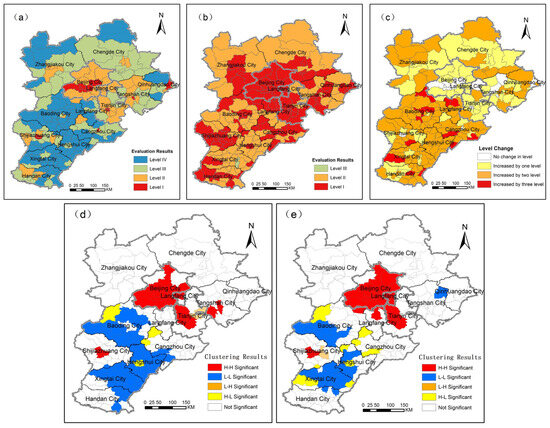 Figure 3. Evaluation results of population distribution indices in 2010 and 2022 (a,b); level changes in population distribution indices from 2010 to 2022 (c); clustering results of population distribution indices in 2010 and 2022 (d,e). Notes: H-H significant indicates that regions with high values were spatially aggregated with adjacent high-value regions, forming distinct “hot spots”. L-L significant signifies that regions with low values were clustered together with neighboring low-value regions, creating distinct “cold spots”. H-L significant occurred when high-value regions were surrounded by low-value regions, resulting in significant “spatial anomalies” or “spatial heterogeneity”. L-H significant was observed when low-value regions were enveloped by high-value regions.