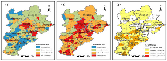 Figure 5. Evaluation results of coordinated development of “population–economy” (a,b); level changes in coordinated development from 2010 to 2022 (c).