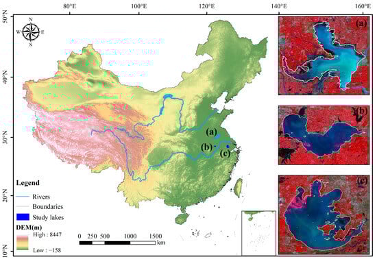Location of the three study lakes. (a) Lake Hongze, (b) Lake Chaohu, (c) Lake Taihu.