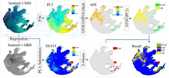 We developed the algorithm for mapping FEAV, SAV, and AB using Sentinel-1 SAR and Sentinel-2 MSI data (Figure 2). It included two main steps: (1) construction of the Sentinel-based submerged aquatic vegetation index (SSAVI) by fusion of the Sentinel-1 SAR and Sentinel-2 MSI imagery, and then mapping SAV using X-Means clustering; (2) construction of the second principal component (PC2), masking non-vegetation spectral characteristic area, and mapping FEAV and AB using OTSU algorithm.