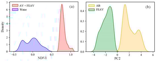 Separability of NDVI and PC2 for lake cover types. (a) Separability for water, and AV and FEAV in NDVI. (b) Separability for AB and FEAV in PC2.