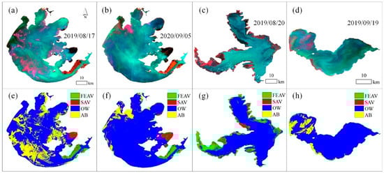 (a–d) False color images (NIR, Red, Green) and (e–h) corresponding classification maps derived from our algorithm in Lake Taihu, Lake Hongze, and Lake Chaohu.