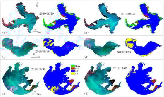 False color images (NIR, Red, Green) with neighboring temporal and corresponding classification maps derived from our algorithm in Lake Hongze (a,b), Lake Chaohu (c,d) and Lake Taihu (e,f).