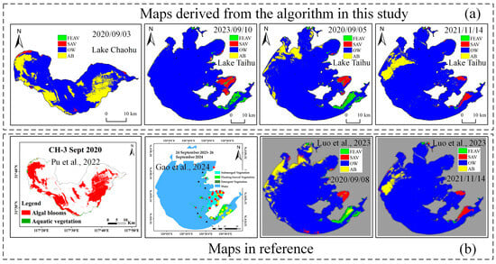 We also compared the maps obtained in this study and from published studies. Specifically, we selected the classification results of Lake Chaohu and Lake Taihu from published studies [10,13,14], and acquired the maps derived from our algorithm that were closest in time. The results show that, despite slight differences in local areas due to variations in satellite data sources and image acquisition times, the overall classification results are consistent (Figure 6).