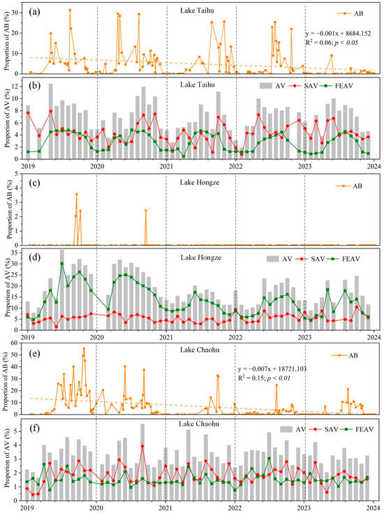 Area change of AB, SAV, and FEAV in Lake Taihu (a,b), Lake Hongze (c,d), and Lake Chaohu (e,f) from 2019 to 2023.