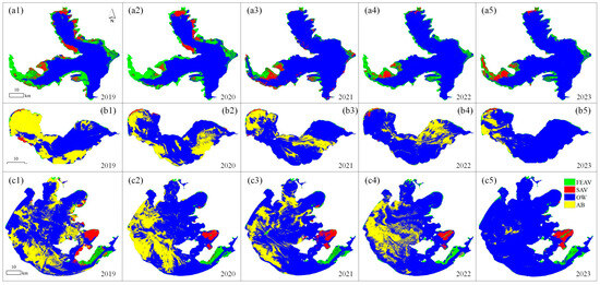 Annual maximum distribution maps of SAV, FEAV, and AB in Lake Hongze (a1–a5), Lake Chaohu (b1–b5), and Lake Taihu (c1–c5) from 2019 to 2023.