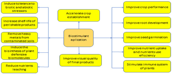 Currently, there are six groups of biostimulants available on the market, such as the following: humic substances such as “humic and fulvic acids”, “protein hydrolysates”, “amino acids”, “biopolymers”, “inorganic compounds”, and “seaweed extracts”, which are widely used in agriculture worldwide [8]. The use of biostimulants has a positive effect on soil biology, increases root and shoot growth, and improves resistance to stress factors [9,10,11,12,13]. The main impact of biostimulants on crops is shown in Figure 1.