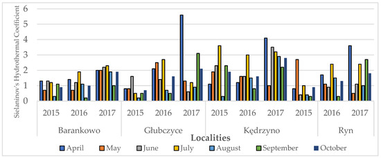 To assess rainfall effectiveness during the growing season, the Sielianinov hydrothermal coefficient was calculated. The value of the hydrothermal coefficient was calculated according to the following formula: k = P/∑t × 10, where P—where monthly sum of precipitation in mm and ∑t—monthly sum of air temperatures > 0 °C [35]. Extremely dry month: k ≤ 0.4, very dry—0.4 < k ≤ 0.7, dry 0.7 < k ≤ 1.0, fairly dry 1.0 < k ≤ 1.3, optimal 1.3 < k ≤ 1.6, quite humid 1.6 < k ≤ 2.0, humid 2.0 < k ≤ 2.5, very humid 2.5 < k ≤ 3.0, and extremely humid k > 3.0. This coefficient enabled the classification of climatic conditions across years and locations. In Kędrzyno, the years 2015 and 2016 were classified as fairly humid, while 2017 was very humid. In Barankowo, 2015 (k = 0.8) and 2016 (k = 1.0) were classified as dry, whereas 2017 was very humid (k = 1.9). In Ryn (Warmian–Masurian Voivodeship), the conditions were classified as dry in 2015 (k = 0.9), fairly dry in 2016 (k = 1.3), and fairly humid in 2017 (k = 1.8). In Głubczyce, the year 2015 was very dry (k = 0.7), 2016 was classified as optimal (k = 1.6), and 2017 as humid (k = 2.1) (Figure 4).