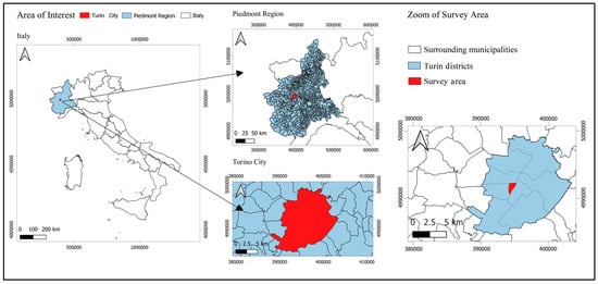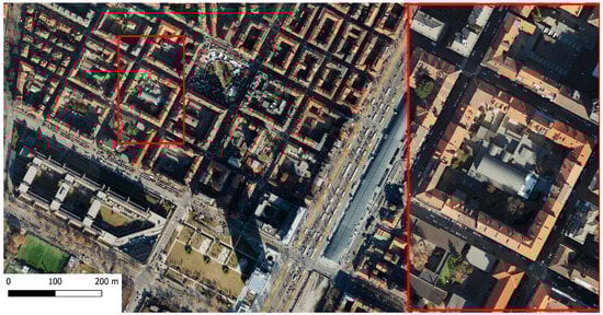 The urban area selected for data collection is presented in Figure 1 and included a portion of the Cit Turin neighborhood, part of the 3rd district precinct of Turin, for an area of about 1.15 km2. The selected area, marked by the presence of the Spina Centrale, served as a strategic setting for this study for multiple reasons. The Spina Centrale is one of Turin’s most significant infrastructure projects in recent years, designed to connect the northern and southern parts of the city with a new arterial road. This infrastructure has spurred substantial urban transformation in the area over the past 15 years, which has been further enhanced by strategic developments like a high-speed railway station, a skyscraper, and the expansion of the Politecnico di Torino’s university campus. This area also encompasses important public infrastructure, including the city’s courthouse, the bus terminal, several metro stations, a public park, and a neighborhood market. The dense urban fabric, described in Figure 2, combined with shaded streets, as illustrated in Figure 3 through an orthophoto obtained from aerial surveys, highlight the limitations in acquiring and conducting detailed analyses of imagery. Shaded streets, in particular, complicate accurate identification and monitoring of road and infrastructure conditions.