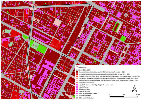 Map of the urban density of the studied area, obtained from the Land Cover Piemonte dataset provided by the Geoportale Piemonte. The map shows the spatial distribution of land use and urban density, providing valuable information on the characteristics of the built environment. Note in particular that the study area consists of a residential area with continuous urban fabric with 80% being impermeable surfaces.