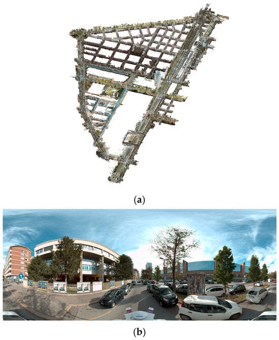 The case study presented focused on the Spina Centrale, a transformative infrastructure project that plays a central role in reshaping Turin’s urban landscape and is integrated into the broader Turin Digital Twin initiative. In this context, an MMS was tested in a specific area to evaluate its potential and integration with other data sources, adhering to the multi-level and multi-sensor approach of the DT project. Since 2022, the municipality of Turin, in collaboration with the Politecnico di Torino, has been developing a digital twin of the entire city based on aerial hybrid data acquisition, with the aim of creating an accessible, navigable digital environment that reflects the behavior of the real world and tracks its evolution over time, including the impact of future urban development [1,2,3]. The current DT of Turin was built upon aerial data acquired in 2022 using a Leica CityMapper-2, developed by Leica Geosystem (part of Hexagon, Heerbrugg, Switzerland), a hybrid airborne sensor combining optical and LiDAR technologies. The Leica CityMapper-2 system is equipped with four oblique RGB cameras inclined at 45°, two nadir-facing cameras (RGB and NIR), a LiDAR unit, and integrated GNSS/IMU technology for precise georeferencing. This aerial survey was conducted at an altitude of approximately 1000 m, achieving a GSD (ground sampling distance) of 5 cm and a point density of 30–40 points per square meter.