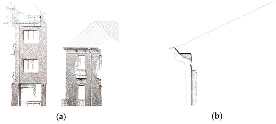 The integration of the aerial and terrestrial datasets is illustrated by (a) zooming in on the roof area of a building and (b) analyzing a profile of the same building. This comparison highlights how the aerial sensor captures the roof, while the terrestrial LiDAR sensor provides detailed data on the building façade.