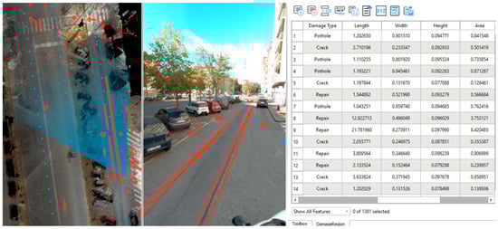 Finally, the results include a comprehensive geodatabase comprising vertical structures, such as utility poles, and horizontal elements, such as road markings and detected defects. The integration of the extracted road infrastructure data into a structured geodatabase represents a fundamental step in supporting the DT framework of the municipality. A well-structured geodatabase serves as the backbone for digital urban management, enabling the seamless incorporation of multisource datasets, real-time updates, and spatial analyses, essential for predictive maintenance and strategic planning. This application not only facilitates detailed analysis and visualization but also supports integration into advanced platforms like GISs and BIMs, ensuring that the information is accessible and actionable for infrastructure management and urban planning.