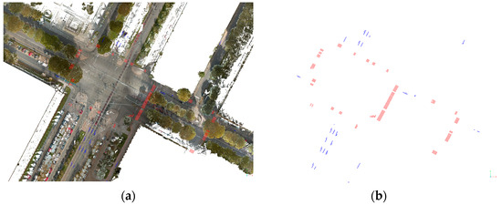 Example of horizontal signage detection: blue vectors represent directional indicators, while red vectors highlight pedestrian crossings. (a) The overlay of vectors on the point cloud with RGB values, demonstrating their spatial alignment. (b) The vector extraction, highlighting discrepancies in geometry due to low signal reflectivity. This issue corresponds to the poor physical condition of the element, reflecting its degraded state in reality.