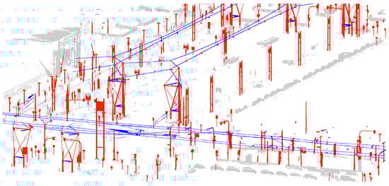 Visualization of the point cloud class for vertical poles (red) and wires (blue), which are key components of road infrastructure. This classification enhances the understanding of the facility elements that shape the urban environment, providing critical data for infrastructure management and planning.