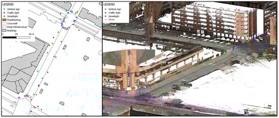 The classification of the point cloud enabled the detailed and targeted analyses of road infrastructure by organizing the dataset into specific categories: ground, buildings, vegetation, and facilities. This systematic organization facilitated the extraction of key features essential for urban asset management. Notably, the ground class allowed for the precise analysis of road surfaces, enabling the identification of cracks, potholes, and road markings, which is critical for pavement condition assessments. The facility class provided an accurate inventory of vertical infrastructure, such as poles and signs, supporting maintenance and planning activities, as shown in Figure 12. Additionally, the exclusion of non-relevant features, such as vegetation, optimized computational resources and ensured focus on critical infrastructure elements. These classification results formed the basis for advanced applications, such as detailed road surface assessments, the development of an urban asset inventory, and seamless integration into the Turin DT. By structuring the data in this way, the classification enhanced both the accuracy and the actionable insights derived from the analyses, supporting scalable and efficient urban management systems.