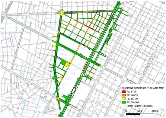 The analysis produced detailed quantitative outputs, including defect counts, spatial distribution, severity classification, and the PCI, a standardized metric summarizing the overall road network condition. The results are visualized in Figure 13 through pavement condition maps, offering actionable insights for targeted maintenance and preventive measures. The thematic map facilitates the identification of critical areas requiring immediate attention and helps with strategizing long-term maintenance plans.