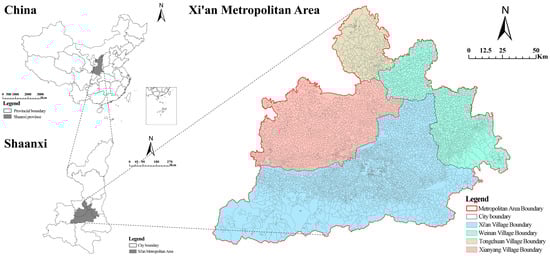 Rural areas within metropolitan regions or urban agglomerations are often simultaneously influenced by functional spillovers from multiple cities. As the core city of the Guanzhong Urban Agglomeration, Xi’an exerts its influence on rural areas beyond its municipal administrative boundaries, necessitating an analysis of urban–rural integration within a broader regional context. Therefore, this study established a research area based on the Xi’an Metropolitan Region, from which suitable villages were selected for analysis. This region encompasses parts of Tongchuan to the north, Weinan to the northeast, and Xianyang to the northwest, spanning four prefecture-level cities (Figure 1).