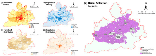 Within this defined scope, selecting villages potentially exhibiting urban–rural integration characteristics surrounding Xi’an was conducted based on established methodologies. The urban–rural gradient division method proposed by Li Ruipeng et al. [28] and the population density threshold approach developed by Zhou Xiaochi et al. [29] were employed as primary references. Villages with impervious surface coverage ranging from 8% to 60% were categorized as peri-urban villages (Figure 2a). These areas were subsequently overlaid with regions exhibiting population densities between 1000 and 5000 persons/km2 (Figure 2b). The preliminary selection was further refined through spatial optimization, incorporating considerations of population distribution patterns (Figure 2c) and arable land configurations (Figure 2d), while maintaining the principle of spatial continuity. This methodological process identified 3804 villages within the Xi’an Metropolitan Region as the final study samples (Figure 2e).