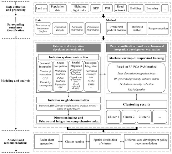 Figure 3 illustrates the research framework of this study, which primarily consists of four steps. First, we collected and pre-processed multi-source data as the basis for sample selection and indicator extraction. Next, we identified the villages included in this study through multi-layer overlay analysis. Then, based on relevant theories of URI (such as the theory of factor flow), we developed a URI development evaluation indicator system encompassing four dimensions: economy, society, space, and ecology. A combined weight method was employed to derive the comprehensive index of URI. Simultaneously, an enhanced algorithm combining random forest–principal component analysis–partitioning around medoids (RF-PCA-PAM) was used for village clustering calculations. Finally, based on the radar chart of the fractal URI index, we synthesized the clustering characteristics, identified rural types, and proposed differentiated development strategies and recommendations in conjunction with the spatial distribution characteristics of the clusters. All these analyses were conducted in R 4.2.3.