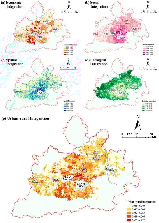 After obtaining the final weights from the game theory, normalized data were used to calculate the corresponding indices for URI development evaluation. These included the economic integration index , social integration index , spatial integration index , and ecological integration index for each dimension. The calculation formulas are as follows: