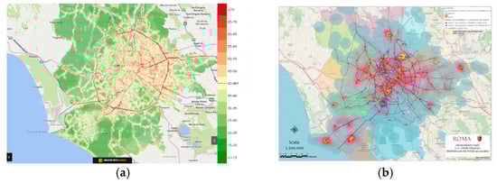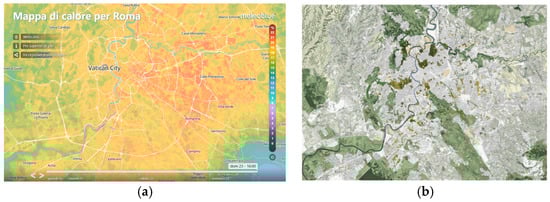 (a) Real-time mapping of the urban heat island in Rome. It can be seen that the most critical areas (orange-red color) are located in the eastern part of the city, while in the western part, the presence of vegetation has a mitigating effect that lowers the urban temperature. (b) Mapping of green areas in Rome.