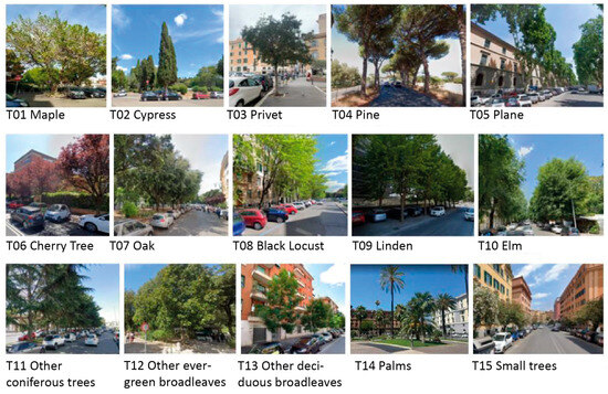 Figure 3. Exemplary images of street trees categorized by dendrological type. - Reclassification of Roads by the “Role” of Trees: roads were reorganized based on the landscape functions required of street trees, following a hierarchical scheme with four road types: R01: radial axes (consular roads), which historically serve as primary routes extending from the city center; R02: roads for the fast flow of traffic between neighborhoods, typically arranged in a ring-shaped layout; R03: “15-min urban axes”, which are the main streets within each district, supporting local accessibility and connectivity; and R04: residential neighborhood roads.