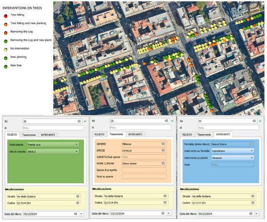 Based on the results of the sample survey, the STMP deems a new, comprehensive census of street trees in Rome is necessary to update and enrich the 2016 census (see Section 2.2 and Table 1). The STMP outlines that each street tree will be assigned a unique code, with data collected using smartphones equipped with the Q-Field application (Figure 4). The data will include information on taxonomy (genus, species, variety), the tree’s condition (e.g., living, dead standing, stump, or vacant spot), and the state of its growth site (e.g., in good condition or requiring restoration). This information will be integrated into the Green Spaces platform, which is being adopted by the Rome Municipality’s Technical Office.