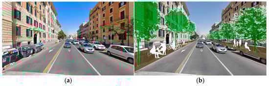 La Spezia Street in Rome (San Giovanni district, central city). The current situation (a) shows that the street has completely lost its tree-lined avenue. (b) The proposed project envisions the reconstruction of tree rows on both sides of the street, along with the redevelopment of pedestrian sidewalks.