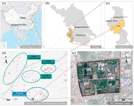 Overview of the study area: (a) location of Jiangsu province in China, (b) location of Nanjing in Jiangsu province, (c) SEU Jiulonghu campus in Jiangning district, (d) university campus distribution map in Nanjing, and (e) satellite map of Jiulonghu campus.