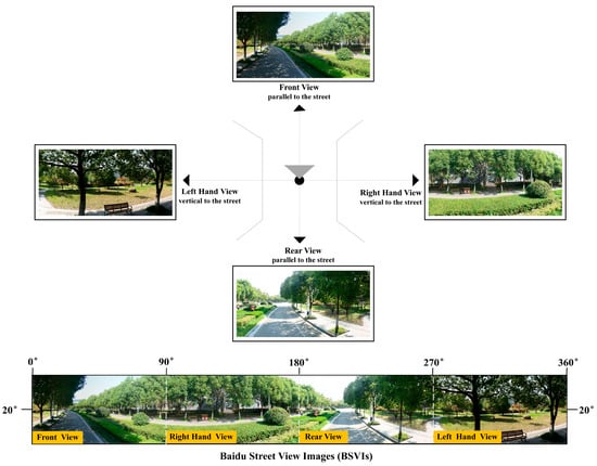 To accurately simulate the perception of the human perspective, the acquisition parameters were set specifically as follows: after the coordinate data of these sample points are converted to the BD09 coordinate system, the pitch angle is set to 20°, the horizontal field of view (fov) is set to 90°, and the maximum number of pixels in the image is set to 1024 × 512 [71]. The street views in four orientations (front, right hand, rear, and left hand) were acquired using the Baidu Map API (https://api.map.Baidu.com/panorama/v2?ak=YOURKEY (accessed on 3 August 2024)) and stitched together to form a 360° panoramic image of the sampling point (Figure 4). On this basis, the 21,388 street view images obtained were cleaned to remove invalid street view image data. Finally, 4917 panoramic images and 19,668 street view images were collected to ensure reliability and accuracy for follow-up analysis.