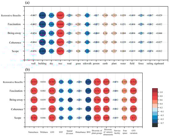 Correlation analysis between objective spatial elements (a); morphological indicators (b); and subjective restorative perception scores.