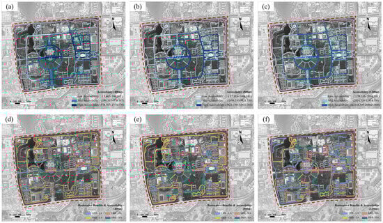 In this study, sDNA based on the ArcGIS platform was used to quantify the walking potential by combining the walking distance and perceived distance while considering the shortest metric distance and the angle change [90]. For the specific analysis, street path centerline maps were extracted from OSM as the basic network data. The “betweenness” index was used to measure the accessibility of each street. In spatial network analysis, the accessibility results at different analysis radii correspond to the travel potential of different behaviors. Based on the walking behavioral modes of university students, the network radius was set at 400 m, 800 m, and 1200 m [91], which characterized the suitable walking distance of 5 min, 10 min, and 15 min, respectively. This approach was employed to simulate and visualize the extent of students’ daily travel activities, thereby identifying the spatial character of the distribution of spatial accessibility. Furthermore, we overlayed the results of the above three accessibility analyses. We selected the overlapping part as an important reference for the accessibility analysis related to space optimization.