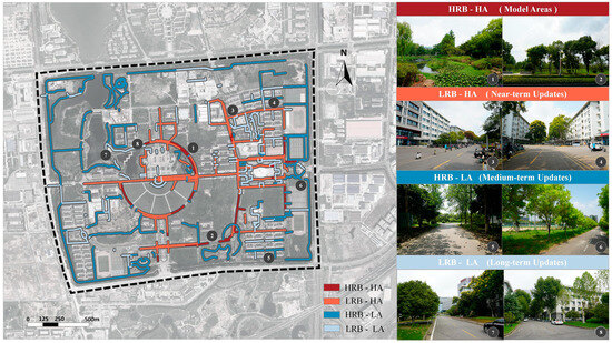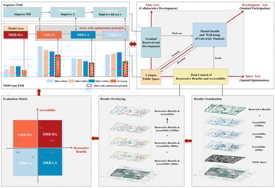 - Overlay Analysis and Optimization Pathway: The results of spatial accessibility analysis based on OSM and sDNA were overlayed to form an evaluation matrix, with two dimensions of restorative benefits and accessibility. Four different areas were identified: high restorative benefits and high accessibility (HRB-HA), high restorative benefits but low accessibility (HRB-LA), low restorative benefits but high accessibility (LRB-HA), and low restorative benefits and low accessibility (LRB-LA). Based on the results above, the optimization pathways with the dual control of restorative benefits and accessibility for campus outdoor public spaces were constructed by combining the three types (LRB-HA, HRB-LA, and LRB-LA) of the spatial dimension and the sequential order (near-term, medium-term, and long-term) of the temporal dimension.