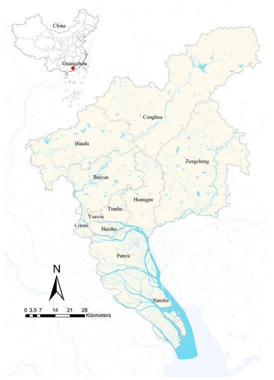 Guangzhou, located in southern China (112°57′–114°3′ E, 22°26′–23°56′ N), spans a total area of 7434.40 km2 and has a population of approximately 18.83 million (Figure 1). As a major economic and technological innovation hub, Guangzhou is one of the most economically vibrant and densely populated regions in China. Guangzhou is characterized by a subtropical monsoon climate and receives an annual average rainfall surpassing 1800 mm, primarily concentrated between May and August. Under the dual pressures of climate change and rapid urbanization, Guangzhou is highly susceptible to urban pluvial flooding, leading to significant economic and infrastructural losses.