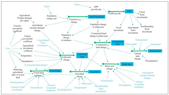 The land use system is a highly complex and interconnected framework comprising multiple subsystems, including the climate subsystem, land use subsystem, economic subsystem, and population subsystem. The interactions among these subsystems significantly influence their respective trajectories, with the population subsystem playing a particularly pivotal role, as demographic shifts drive changes across other subsystems. Urban and rural population dynamics are encapsulated within the population subsystem. The increasing demand for agricultural products is often a direct consequence of population growth, which, in turn, alters the minimum required area of arable land. The economic subsystem exerts substantial influence over both the population and land use subsystems. Economic expansion, particularly through increased investments in urban development, leads to a reduction in agricultural land and an expansion of built-up areas. Consequently, the economic subsystem is expected to have a profound impact on land use changes [45]. The climate subsystem primarily affects croplands, grasslands, and forests through long-term variations in precipitation and temperature. Temperature fluctuations influence the growth and regeneration capacity of croplands, forests, and grasslands in distinct ways. Similarly, a moderate increase in precipitation may suffice to meet vegetation water demands, thereby inducing changes in agricultural and forested areas. Land use changes, particularly land conversion processes, are closely linked to the land use subsystem [46]. In this study, the land use subsystem includes six distinct categories: constructed lands, cultivated lands, grasslands, forest lands, water area, and unused land. The transformation processes of each land use type are influenced by a range of socioeconomic and climatic factors, as well as the constraints arising from the interactions between different land use categories. To systematically analyze these interdependencies, a system dynamics model for the study area is developed using Vensim software 10.3.0 (http://vensim.com/, accessed on 25 September 2024), ensuring a comprehensive representation of the feedback mechanisms driving land use evolution (Figure 2).