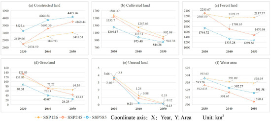 Under the extreme SSP5-8.5 scenario, constructed land experiences a sharp increase. By 2050, the total area of constructed land is projected to expand to 4475.96 km2, more than twice in 2020. This rapid expansion of constructed land is primarily driven by the emphasis on rapid economic development in the SSP5-8.5 scenario, with minimal consideration given to ecological factors. This results in a surge in population growth and economic development, leading to increased demand for land. In contrast, from 2020 to 2050, substantial reductions are anticipated in the areas of forest, cropland, and grassland. Notably, the area of grassland is expected to decrease to 24.25 km2, a mere 12.12% of the grassland area in 2020. Under the extreme SSP5-8.5 scenario, the expansion of constructed land will lead to the disappearance of significant amounts of forest and grassland by 2050.