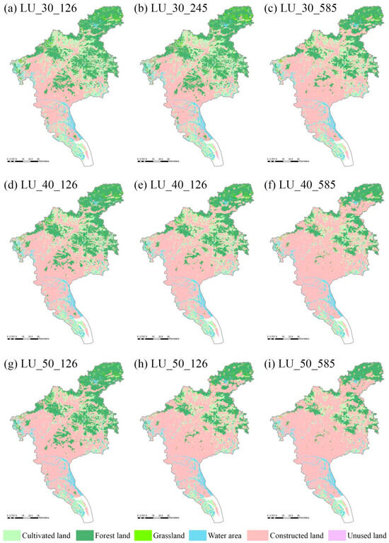 The SSP2-4.5 scenario represents a moderate development pathway. As anticipated, the rate of constructed land expansion is moderate. By 2050, the area of constructed land is projected to increase to 4160.44 km2, more than twice that of 2020. In contrast, the area of forest land continues to decrease. The areas of cultivated land and grassland are expected to shrink to 1470.08 km2 and 43.43 km2, respectively. The expansion of constructed land has encroached upon a larger portion of forested areas, with development spreading outward from existing urbanized regions.