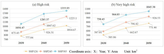 In the SSP2-4.5 moderate development scenario, urban flood susceptibility shows steady growth, with an increase that falls between the trends observed in the SSP1-2.6 and SSP5-8.5 scenarios. This reflects the trade-off effect between economic growth and ecological protection. Notably, under the SSP5-8.5 extreme development scenario, urban flood susceptibility shows a sharp upward trend, with the area of very high and high susceptibility reaching 136% and 134%, respectively, compared to the SSP1-2.6 scenario. This significant difference is primarily attributed to the development model prioritizing economic growth over ecological protection in the SSP5-8.5 scenario, which leads to chaotic urban expansion and drastic changes in land use patterns.