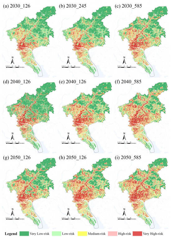 The spatio-temporal changes in urban flood susceptibility in Guangzhou, China. (a,d,g) represents the spatio-temporal changes in urban flood susceptibility under a sustainable development scenario; (b,e,h) denotes the spatio-temporal changes in urban flood susceptibility under a moderate development scenario; (c,f,i) denotes the spatio-temporal changes in urban flood susceptibility under a conventional development scenario.