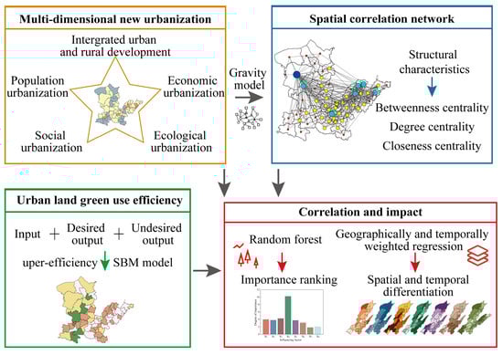 The contradiction between people and land in the process of new urbanization development requires the improvement of land use efficiency, and the improvement of land use efficiency also helps to promote the improvement of urbanization level [21]. Both share the ultimate goal of achieving high-quality regional development [22]. This paper aims to systematically integrate new urbanization and ULGUE through multidisciplinary methods and models. By exploring the impact of new urbanization and its spatial correlation networks on ULGUE, this study will provide significant insights into promoting the coordination of regional human-land systems.