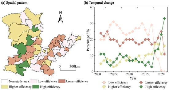 ULGUE was divided into four categories by the quartile method: low efficiency, lower efficiency, higher efficiency, and high efficiency. From the perspective of space (Figure 3a), ULGUE in the middle reaches was higher than that in the lower reaches.